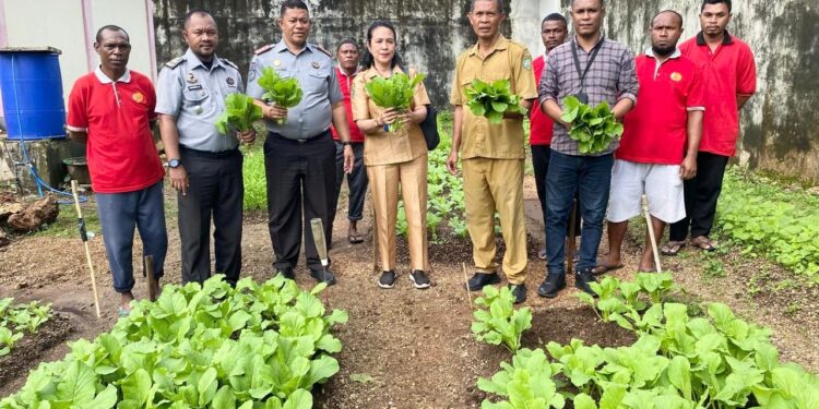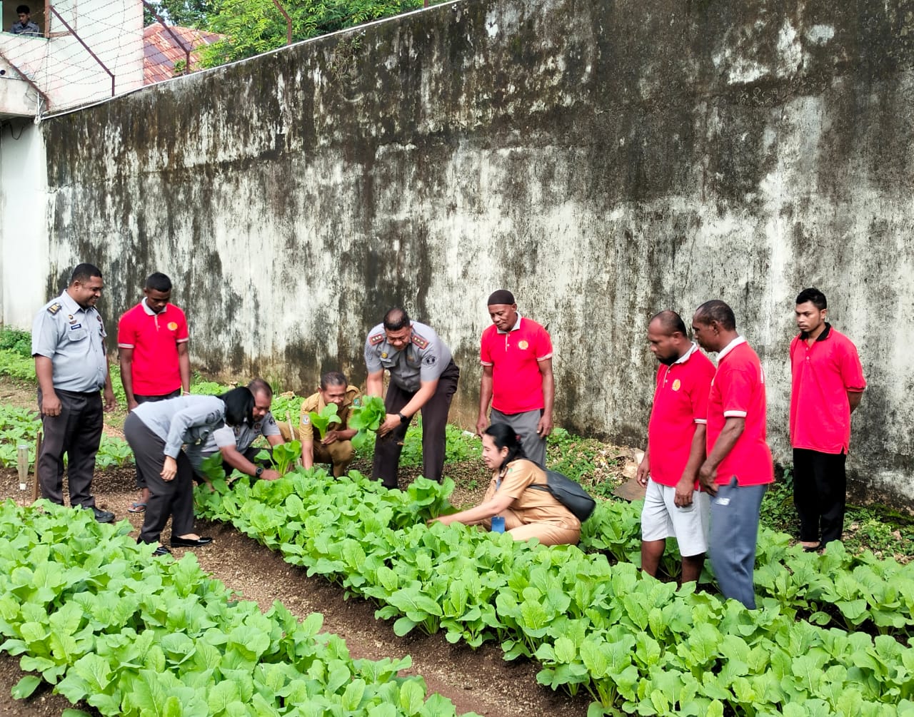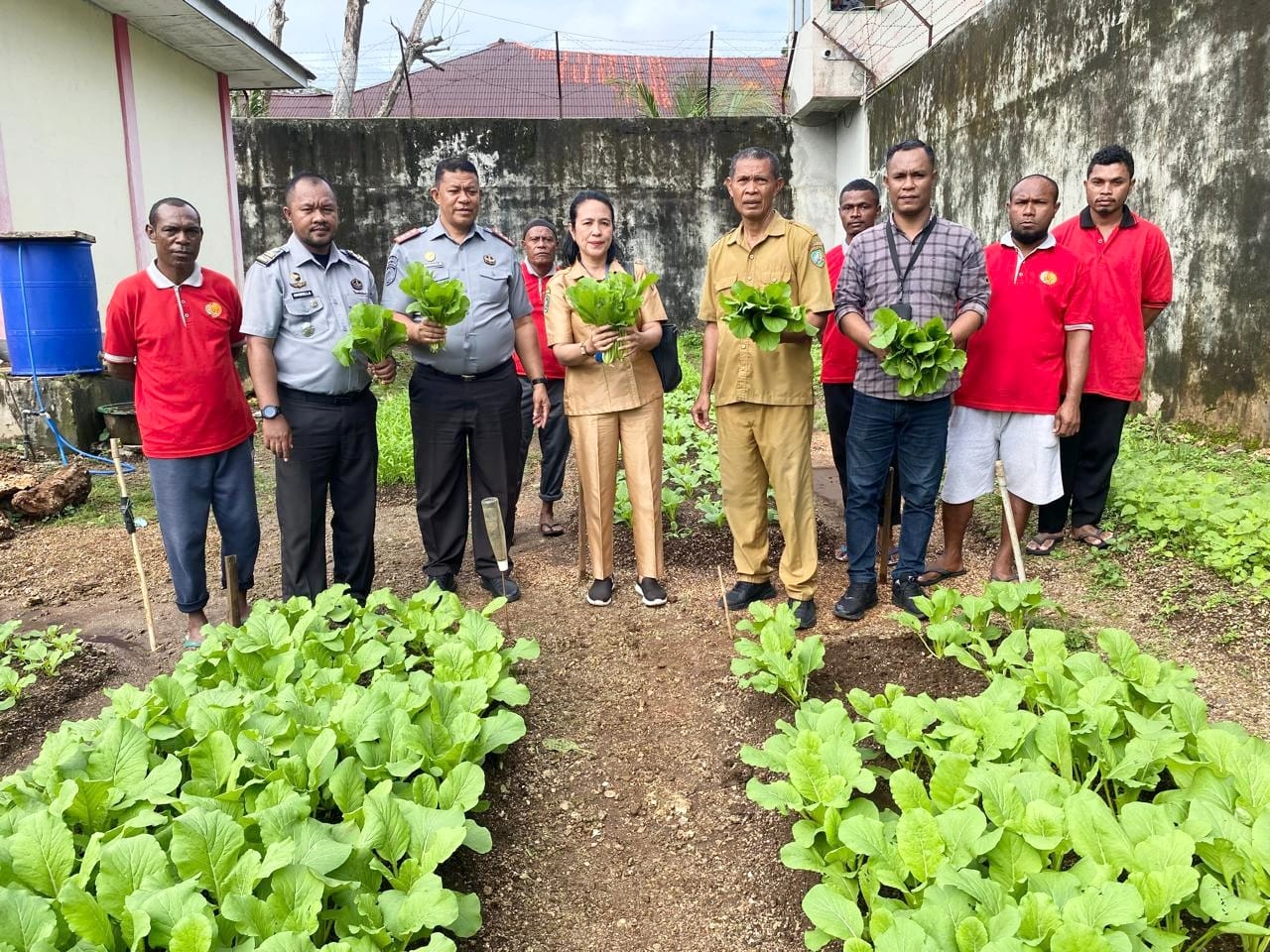 REFMAL.ID,-LANGGUR- Suasana penuh semangat menyelimuti area pertanian terpadu di lingkungan Lembaga Pemasyarakatan Kelas IIB Tual, saat Sekretaris Dinas Pertanian Kabupaten Maluku Tenggara (Malra), Irene Matmey dan Koordinator Penyuluh Pertanian Malra Remigius Rejaan meninjau langsung hasil panen sayuran yang dibudidayakan oleh warga binaan, Selasa (24/6/2025).