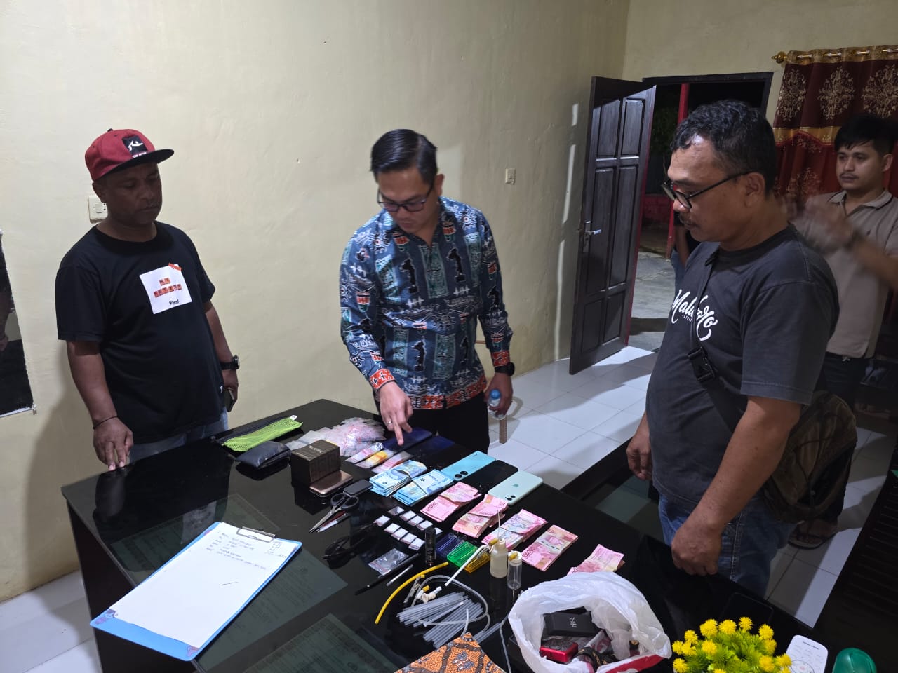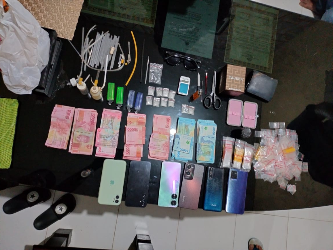 Setelah dilakukan penyelidikan, petugas berhasil mengamankan tersangka bersama barang bukti berupa 10 sachet narkotika jenis sabu, uang tunai sebanyak Rp. 6.000.000, (enam juta rupiah), 6 buah handphone, 5 buah korek api gas merk tokai, 2 alat hisap sabu (bong), 3 buah alat sekop sabu, 1 buah alat timbangan digital, 18 buah pipet plastik, 3 pak plastik bening yang masing-masing berisikan 100 buah, 265 buah sachet plastik bening, 1 buah gunting, 1 buah alat semprot merk magic power, 1 buah jam tangan merk skmei, 1 buah box warna coklat keemasan merk tajima, 1 buah kaca mata hitam, 1 buah box pinset warna silver, 1 buah tas kecil warna hijau hitam merk joico.