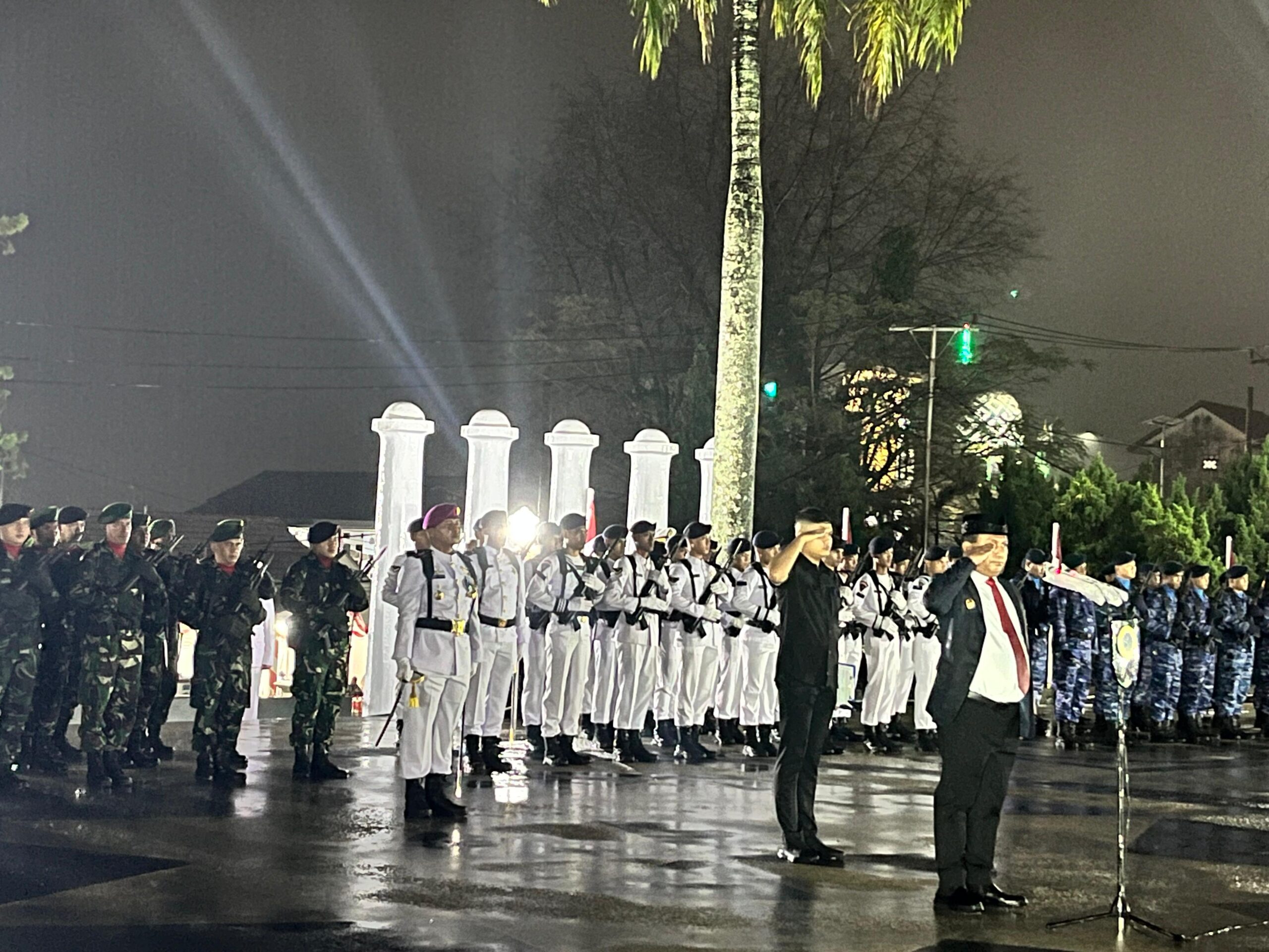 Abdullah Vanath, bertindak selaku Inspektur Upacara. Ia hadir bersama Sekretaris Daerah, unsur Forum Koordinasi Pimpinan Daerah (Forkopimda), jajaran pimpinan OPD, serta petinggi TNI dan Polri. Seluruh peserta tampak mengenakan pakaian dinas upacara lengkap, berdiri dalam barisan rapi meski diguyur hujan malam yang tak kunjung reda.