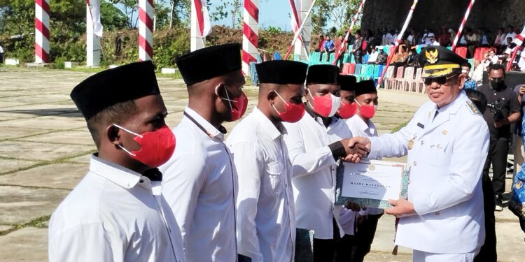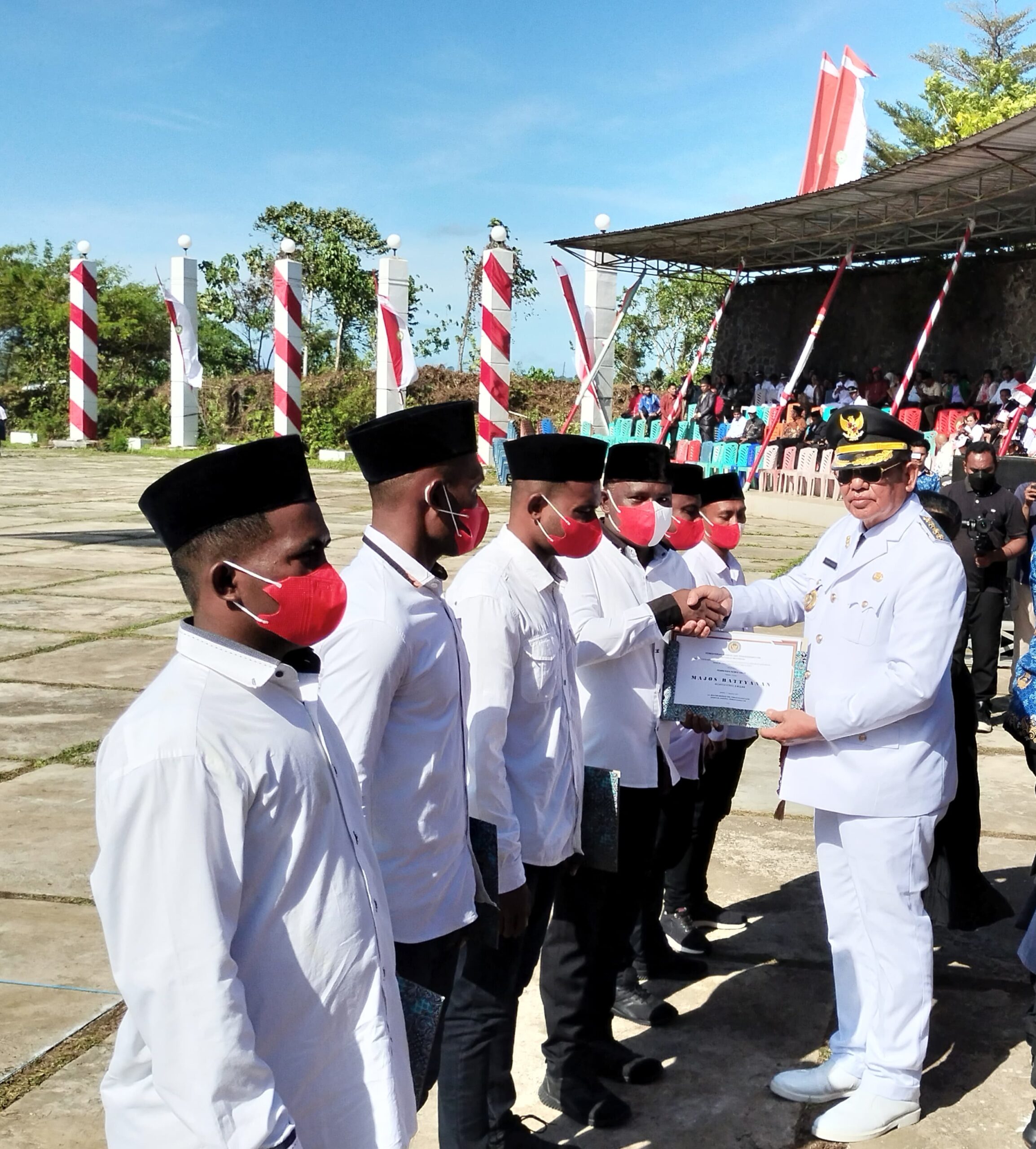 REFMAL.ID, MALRA- Dalam momentum peringatan Hari Ulang Tahun (HUT) ke-80 Kemerdekaan Republik Indonesia, Bupati Maluku Tenggara, Muhammad Thaher Hanubun, menyerahkan secara simbolis Surat Keputusan Remisi Umum dan Remisi Dasawarsa kepada enam perwakilan warga binaan Lapas Kelas IIB Tual, Kanwil Ditjenpas Maluku. Penyerahan dilakukan usai upacara pengibaran bendera HUT RI yang berlangsung di Lapangan Kantor Bupati Maluku Tenggara, Minggu (17/8/2025).