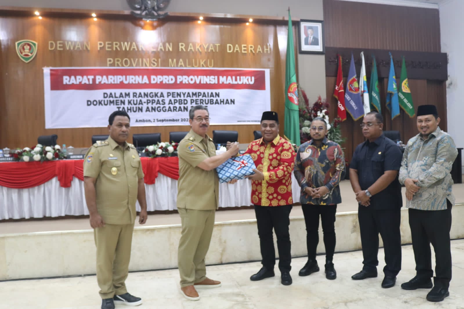 REFMAL.ID, Ambon – Gubernur Maluku Hendrik Lewerissa secara resmi menyerahkan dokumen Kebijakan Umum Anggaran serta Prioritas dan Plafon Anggaran Sementara (KUA-PPAS) Perubahan APBD Tahun Anggaran 2025 kepada Ketua DPRD Maluku Benhur George Watubun di Ruang Rapat Paripurna DPRD Provinsi Maluku, Karang Panjang, Kecamatan Sirimau, Ambon. Selasa (2/9/2025).