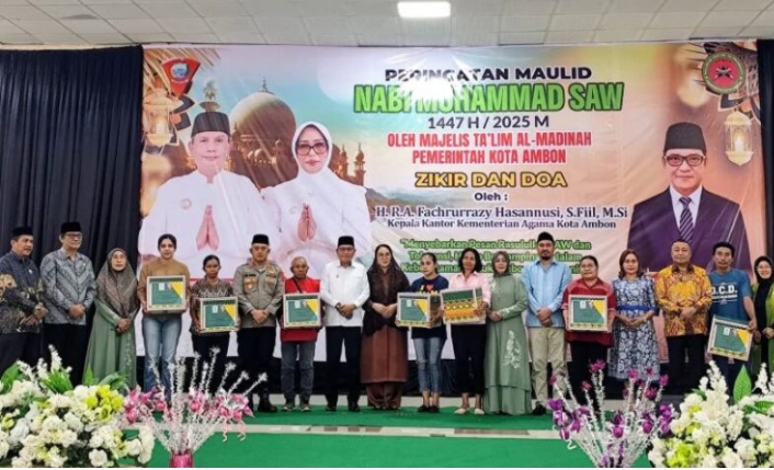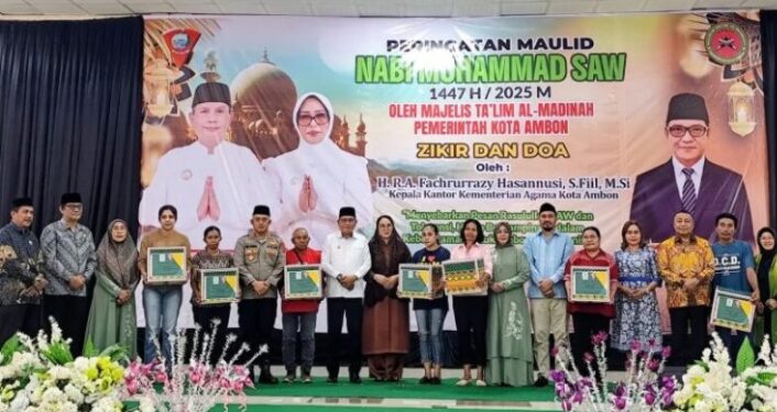 Referensimaluku.id, Ambon  Pemerintah Kota (Pemkot) Ambon mengadakan peringatan Maulid Nabi Muhammad SAW 1447 H/2025 yang digelar Majelis Ta’lim Al-Madinah Pemerintah Kota Ambon di Islamic Center, Kamis (2/10/25).