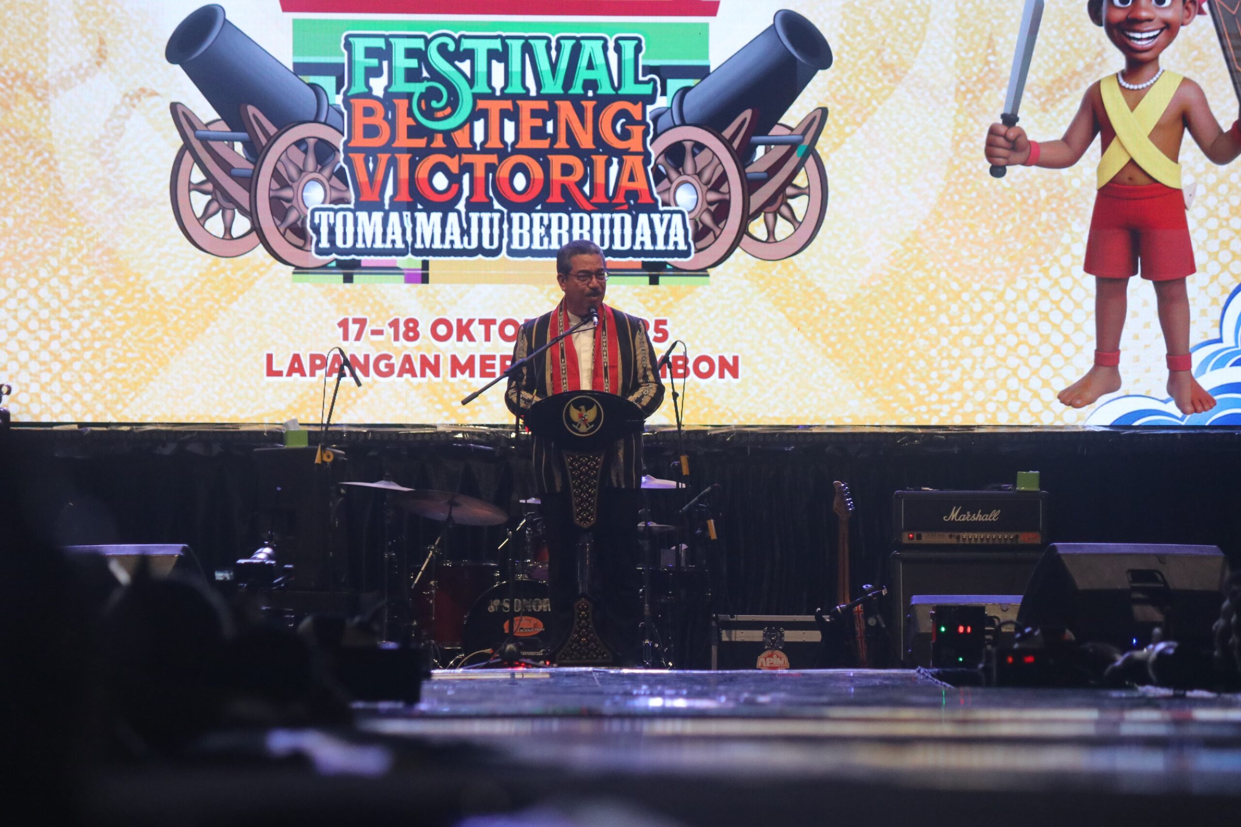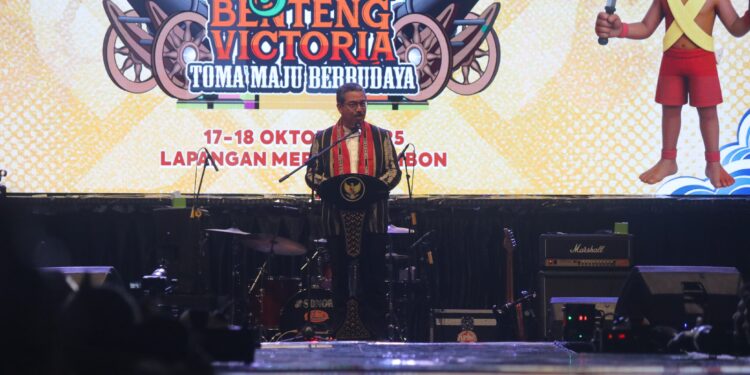 Referensimaluku.id, Ambon – Gubernur Maluku, Hendrik Lewerissa, menyaksikan pembukaan Festival Banteng Victoria yang ditandai pemukulan tifa oleh Wakil Menteri Dalam Negeri, Bima Arya, Wakil Gubernur Maluku Abdullah Vanath dan Wali Kota Ambon, Bodewin Wattimena di Lapangan Merdeka, Jumat (17/10/2025).