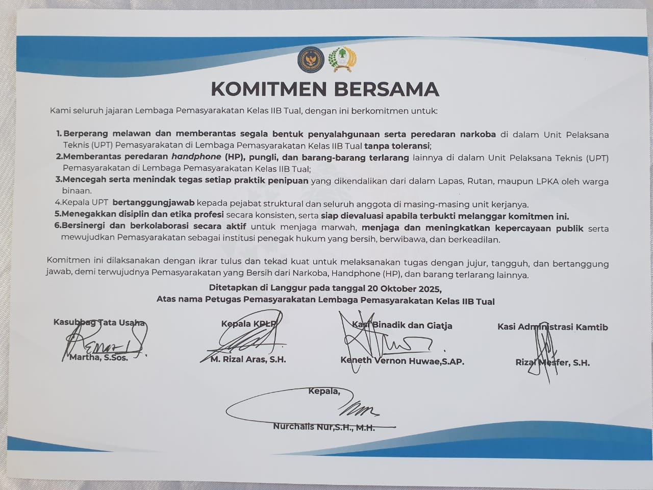 Komitmen ini juga mencakup peningkatan kualitas pembinaan bagi warga binaan serta peningkatan sinergitas dengan berbagai pihak terkait. Kepala Lembaga Pemasyarakatan Kelas IIB Tual, Nurchalis Nur, menjelaskan bahwa komitmen ini akan menjadi pedoman bagi seluruh pegawai dalam menjalankan tugas sehari-hari.