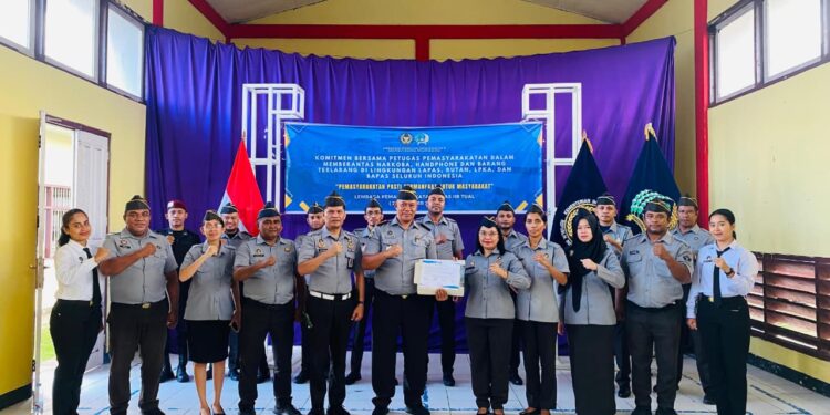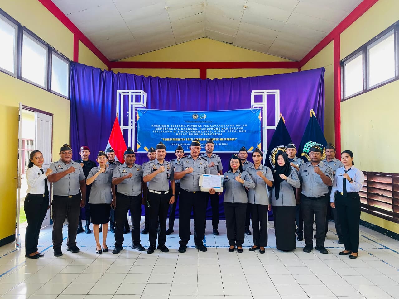 Referensimaluku,-TUAL- Bertempat di Aula Karel Satsuitubun Lapas Kelas IIB Tual, Kantor Wilayah Ditjenpas Maluku, seluruh pegawai mengikuti prosesi penandatanganan komitmen bersama yang berisi poin-poin penting terkait peningkatan disiplin, pencegahan pungutan liar (pungli), dan pemberantasan narkoba di lingkungan Lapas Kelas IIB Tual, Senin (20/10/2025).