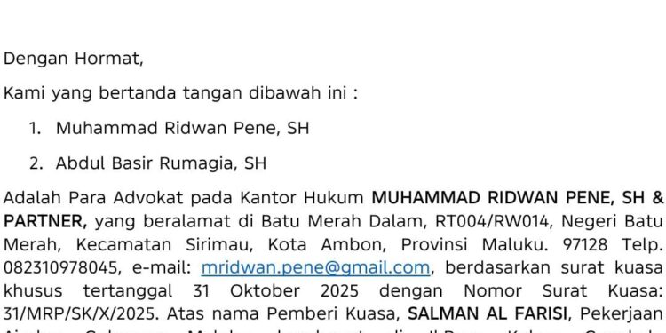 “Ini soal harga diri klien kami, apalagi klien kami ini adalah bertugas sebagai mengawal Pak Gubernur, maka itu pilihan untuk mengadu ke dewan pers, adalah hal yang tepat untuk menguji kebenaran fakta penulisan berita tersebut, sudah memenuhi kaedah jurnalistik atau kode etik jurnalistik dimaksud,”ungkap kuasa hukum Salman, Muhammad Ridwan Pene dan Abdul Basir Rumagia dalam rilis yang diterima media ini di Ambon, Sabtu (8/11/2025).