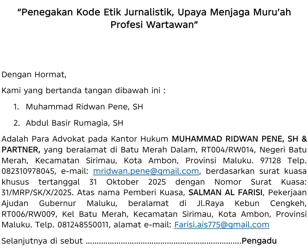 “Ini soal harga diri klien kami, apalagi klien kami ini adalah bertugas sebagai mengawal Pak Gubernur, maka itu pilihan untuk mengadu ke dewan pers, adalah hal yang tepat untuk menguji kebenaran fakta penulisan berita tersebut, sudah memenuhi kaedah jurnalistik atau kode etik jurnalistik dimaksud,”ungkap kuasa hukum Salman, Muhammad Ridwan Pene dan Abdul Basir Rumagia dalam rilis yang diterima media ini di Ambon, Sabtu (8/11/2025).