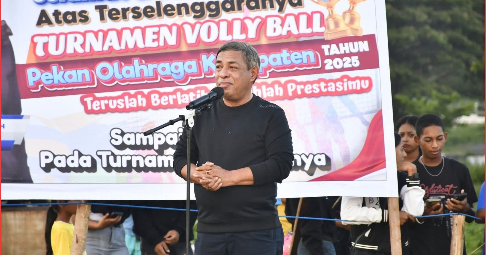 Dalam sambutannya, Bupati Noach menyampaikan rasa syukur pada Tuhan Yang Maha Kuasa karena seluruh rangkaian kegiatan Turnamen Bola Voli Tahun 2025 di tingkat Kabupaten MBD dapat berjalan dengan baik hingga pertandingan final cabang voli putra digelar tuntas.