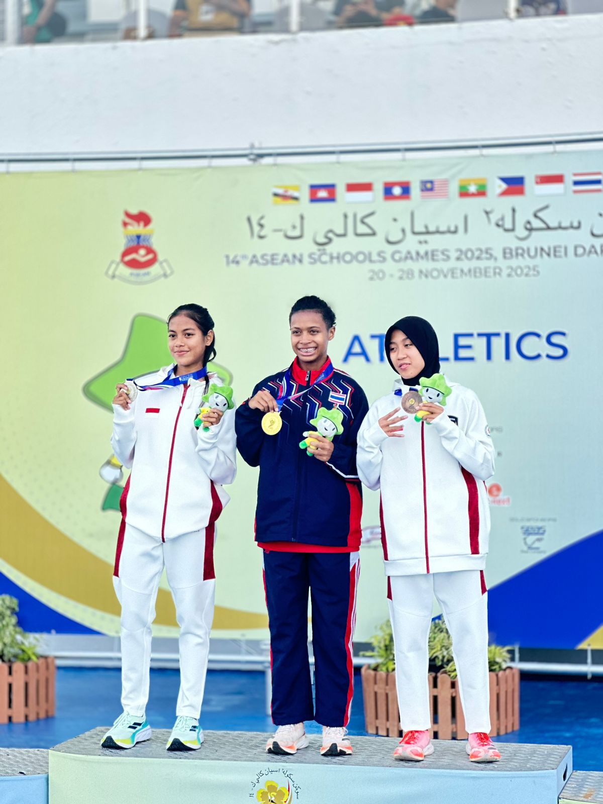 Referensimaluku.id, Ambon – Pelari andalan Indonesia Girsha Imanuela Saimima mampu menyabet perak di nomor final lari 100 meter puteri “ASEAN School Games” di Brunai Darussalam, 23-26 November 2025. Tampil penuh semangat di partai pamungkas di nomor spesial jarak pendek di Indoor Stadium Hasanah Bolkiah, Brunai Darussalam, Minggu (23/11) waktu setempat, atlet binaan Pusat Pendidikan dan Latihan Pelajar (PPLP) Maluku itu akhirnya finish di urutan kedua dengan mencatat waktu 22.12 menit.