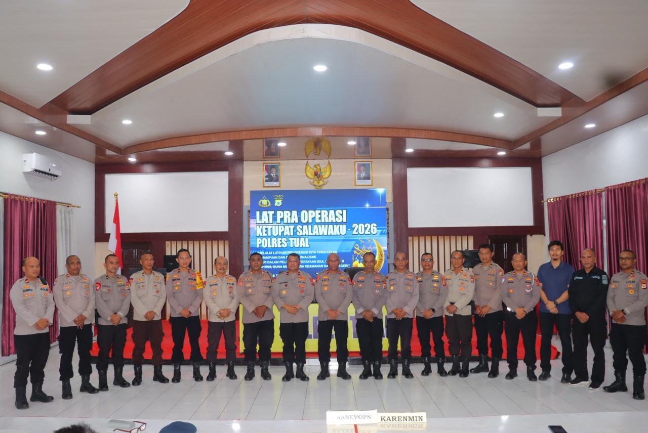 Referensimaluku.id, -Tual – Dalam rangka memastikan kesiapan pengamanan Hari Raya Idul Fitri 1447 Hijriah, Polres Tual menggelar kegiatan Latihan Pra Operasi (Lat Pra Ops) Ketupat Salawaku 2026. Kegiatan ini dilaksanakan di Aula Jananuraga Polres Tual, Selasa (10/3/2026).