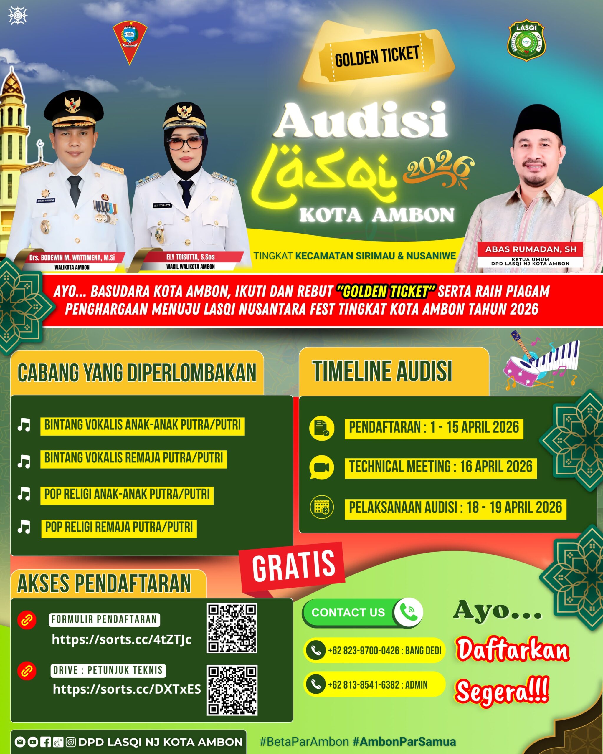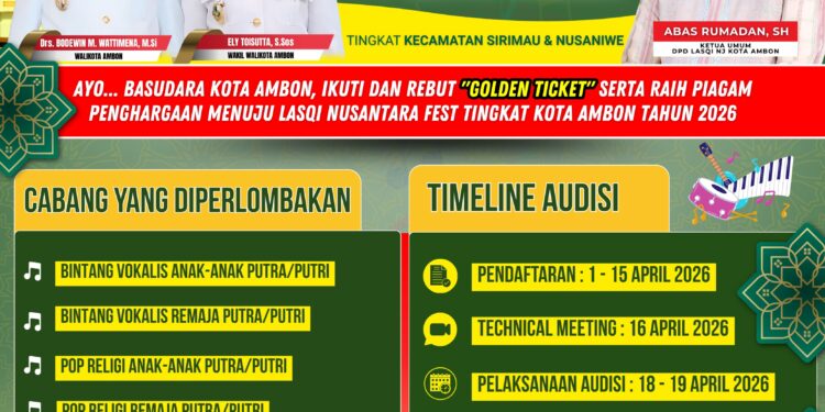 “LASQI Kota Ambon membuka audisi bagi anak-anak dan remaja yang memiliki bakat vokal untuk mengikuti seleksi pada cabang vokalis dan pop religi,” ujarnya,Senin 6 April 2026 di Ambon