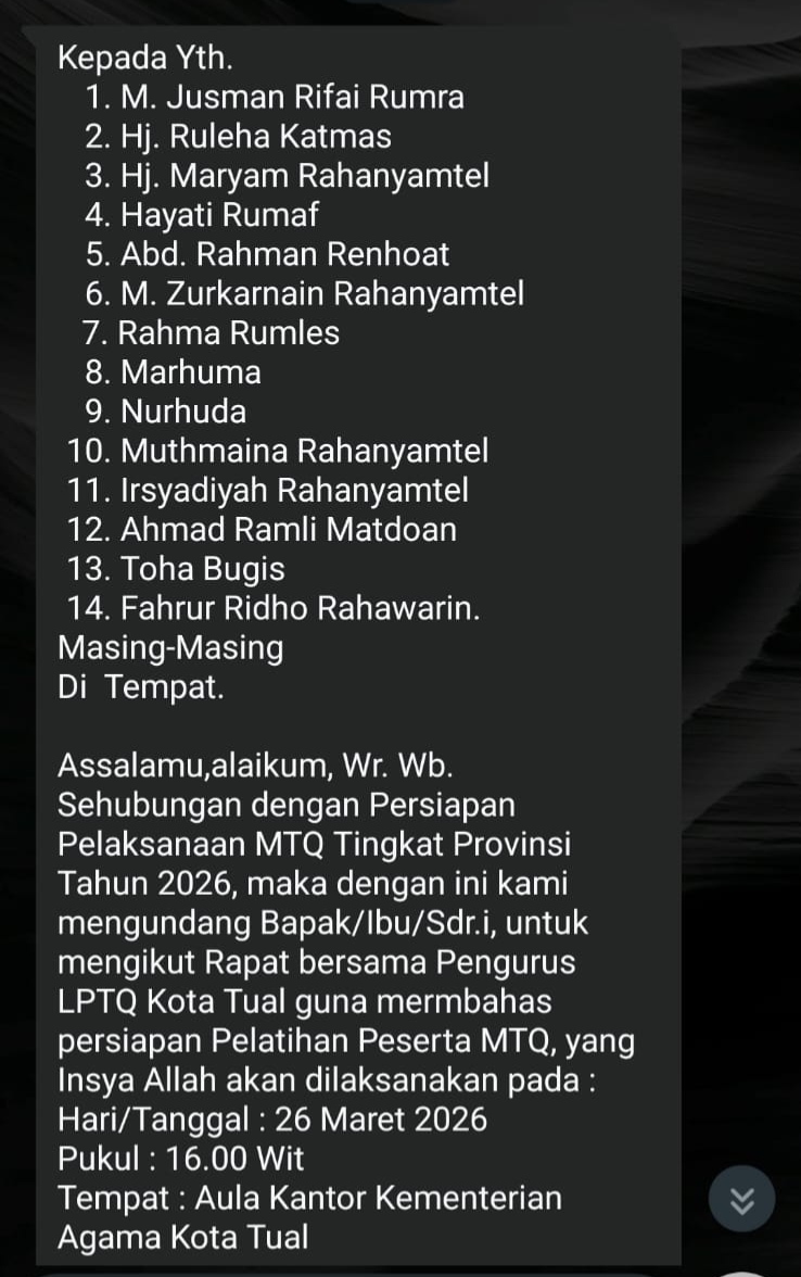 Permasalahan mencuat setelah beredarnya sebuah surat undangan rapat melalui aplikasi WhatsApp yang ditujukan kepada pengurus LPTQ Kota Tual. Surat tersebut mengajak pengurus untuk menggelar rapat membahas persiapan pelatihan peserta Musabaqah Tilawatil Qur’an (MTQ) menuju MTQ tingkat Provinsi.