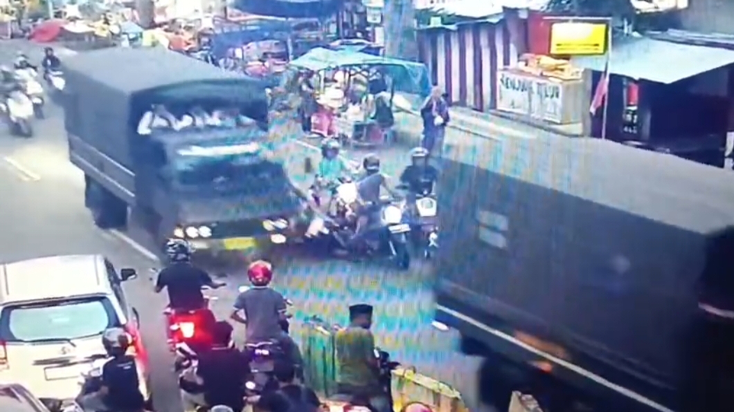 Sepeda motor tersebut kemudian bersenggolan dengan bagian belakang truk terakhir dalam rombongan, sehingga pengendara dan penumpangnya terjatuh.